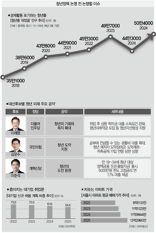 조기 대선을 앞두고 청년층을 겨냥한 주요 후보들의 행보에 속도가 붙고 있다. 대학교 학생식당을 방문하고, 지방을 돌며 이야기를 듣고, 거리로 나가 청년의 손을 잡는다. 하지만 후보들이 내놓은 청년 공약의 중심은 이번에도 '돈 빌려주기'다. 이 정도 공약으로 미래를 기대할 수조차 없는 청년을 달랠 수 있을까. '공약논쟁前' 청년 미래편이다.