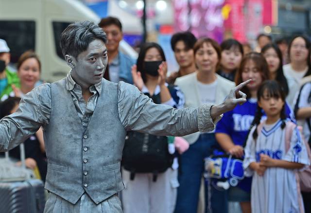 모처럼 화창한 날씨를 보인 25일 오후 대구 중구 동성로를 찾은 주말 나들이객들이 팝핀마임댄서 '양철인간' 조대호씨의 거리 공연을 보며 즐거운 시간을 보내고 있다. 김진홍 기자 solmin@idaegu.com