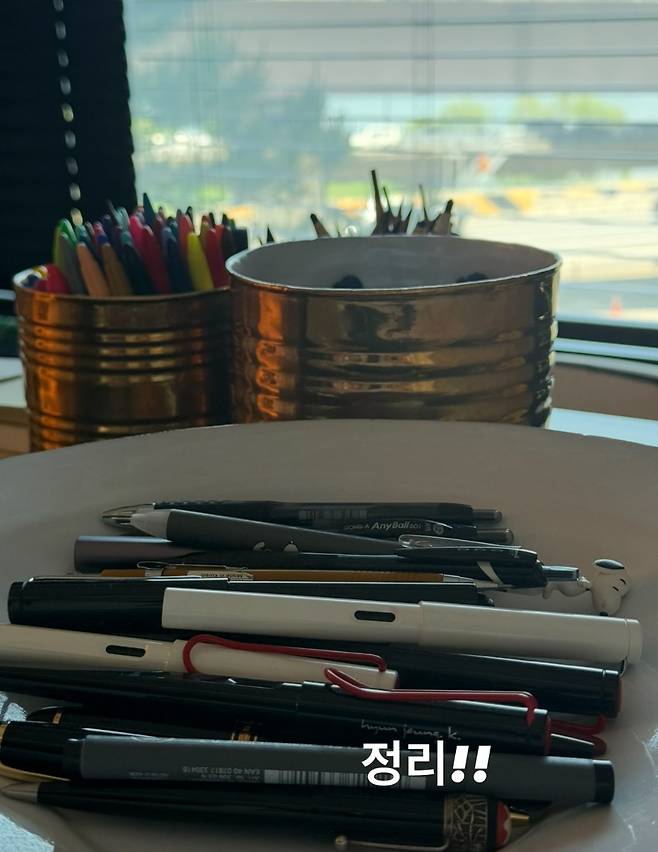 25일 고현정은 "정리"라는 글과 함께 수십 개의 펜이 놓여져 있는 사진을 공개했다. 고현정이 꺼내놓은 펜 뒤에도 깡통 모양의 연필꽂이에는 수심개의 펜이 꽂혀져 있다.