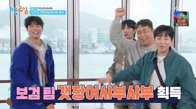 특히 이상이는 괜찮냐는 질문에 "아니요"라고 시무룩해졌다. 패자의 메뉴는 채소&모둠 버섯. 박보검은 버섯이 먹고 싶다며 갯장어와 바꿔주려 했지만, 제작진이 이를 저지했다. 반면 딘딘은 이상이가 먹으면 안 되는 국물을 먹는다고 제보했고, 이상이는 "'1박 2일'이 이렇게 삭막할 줄 몰랐다"라고 토로했다.