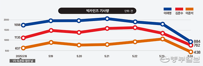 김문수 후보는 정치개혁 비전 발표 기자회견을 연 22일에 관련 기사가 1천616건을 기록했다. 이준석 후보는 보수 단일화에 관한 부정적 입장을 밝힌 23일 1천63건의 기사가 쏟아졌다.