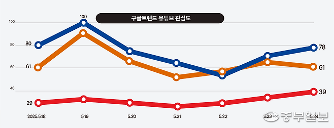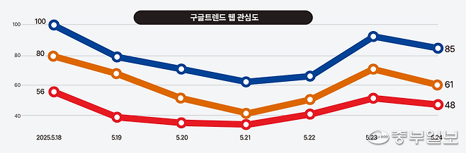◇온라인 관심도 '어대명' 지속… 이준석은 TV토론 주목=지난 18일부터 24일까지 구글 트렌드에서 '이재명'·'김문수'·'이준석' 키워드를 비교 검색한 결과 이재명 더불어민주당 후보가 가장 높은 관심도를 보였다. 세 후보 모두 높은 관심을 받은 날은 경제를 주제로 첫 TV토론이 열린 지난 18일이었으며, 이재명 후보가 관심도 최고치인 100을 기록했다.