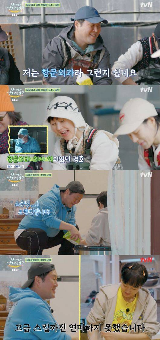 반면 방법을 터득한 윤경호는 “아 이제 알았다. (굴 껍데기의) 틈이 살짝 벌어졌을 때 (칼을 넣어서) 사이를 끊어주면 버러진다”라고 설명했다. 이어 박준면이 “이거 구멍 찾기가 보통 일이 아니네”라고 하자 윤경호는 “저는 항문외과라 그런지 쉽네요. 항문 쪽에 문제 있으면 오세요”라고 말해 웃음을 자아냈다.