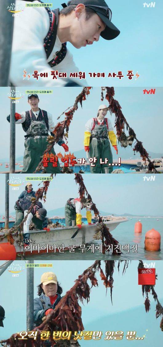 이후 굴 따기 잡업을 마친 멤버들은 이번엔 굴 까기 도전했다. 염정아는 “난 (굴의 틈을) 못 찾겠다”라고 했고, 임지연도 “쉽지 않네. 진짜 잘 안 된다”라고 어려움을 토로했다.