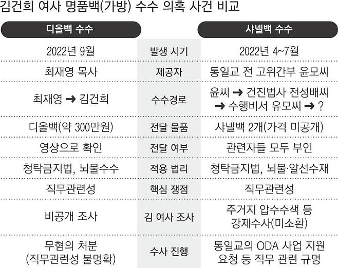 두 사건은 2022년 대선 이후 김 여사에게 고가의 명품가방이 전달됐다는 점에서 유사하다. 300만원 상당 디올백은 2022년 9월 최재영 목사가 직접 김 여사에게 건넸고, 서울의소리가 2023년 11월 이 장면을 공개했다. 샤넬백 2개는 전 통일교 간부 윤모씨가 2022년 4~7월 건진법사 전성배씨를 통해 김 여사 측에 전달한 것으로 검찰은 본다. 샤넬백은 김 여사 수행비서 유모씨에게 전달된 사실까지 확인됐다.