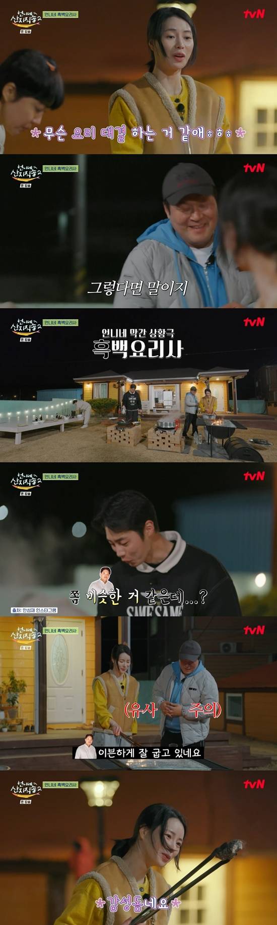 저녁 준비 중 임지연이 "(우리) 무슨 요리 대결하는 것 같다"고 말했다. 이에 윤경호가 "이건 뭔가요"라며 요리 프로그램 사회자처럼 나섰다.
