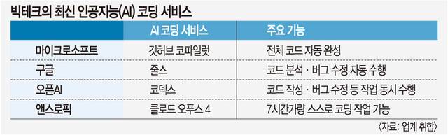 빅테크들이 코딩 업무에 특화된 인공지능(AI) 서비스를 잇따라 내놓고 있다. 개발자가 실시간으로 명령하지 않아도 스스로 코드를 생성하고 버그(오류)를 수정하는 기술이 핵심이다.