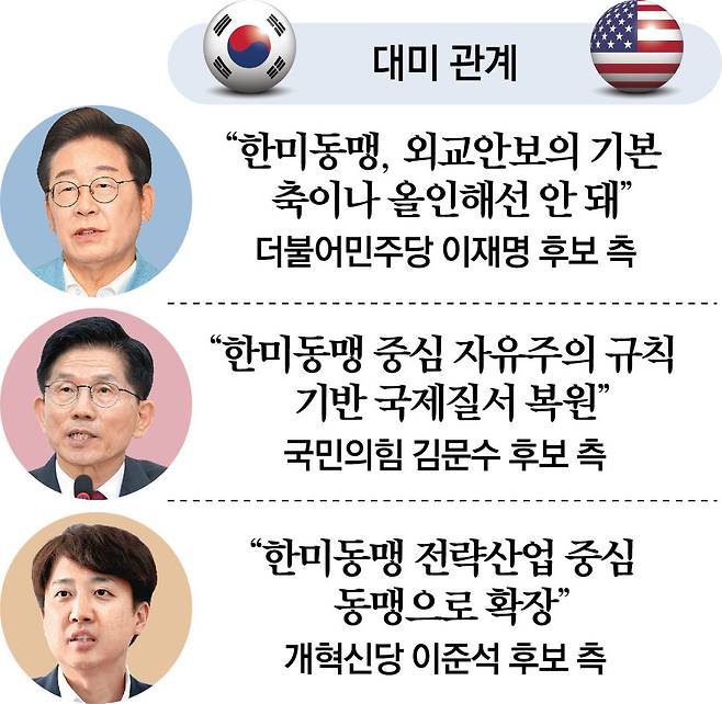 김 후보 측은 또 “한미 현안을 해결하기 위해 당선 즉시 한미 정상회담을 제안할 것”이라며 “조선, 액화천연가스(LNG), 방산, 반도체, 원전을 아우르는 포괄적 협상을 추진할 것”이라고 밝혔다. 이준석 개혁신당 대선 후보는 경제안보 중심의 실용외교를 강조했다. 이준석 후보는 “반도체, 배터리, 인공지능(AI), 양자 기술 등 기술 역량을 바탕으로 미국과는 수직적 동맹이 아닌 수평적 기술 동맹을 구축하겠다”고 했다. 중국과의 관계도 “실익 중심의 협력은 열어두되 기술 탈취, 불공정 경쟁, 안보 침해 행위엔 단호히 대응하겠다”고 했다.