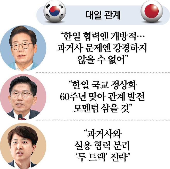 반면 김 후보 측은 “한일 간 현안에서 일본 정부의 적극적 행보를 요구할 것”이라며 “한미일 안보 협력을 강화하고 국교 정상화 60주년을 한일 양국 관계 발전의 모멘텀으로 삼을 것”이라고 강조했다. 이재명 후보는 한일 경제·문화 협력과 과거사 분리 대응을, 김 후보는 한일 관계 강화에 방점을 찍은 것이다. 이준석 후보도 “과거사와 실용 협력의 분리라는 투 트랙 전략을 통해 과거사 대응과 경제 안보 협력 정상화를 병행하겠다”고 강조했다.