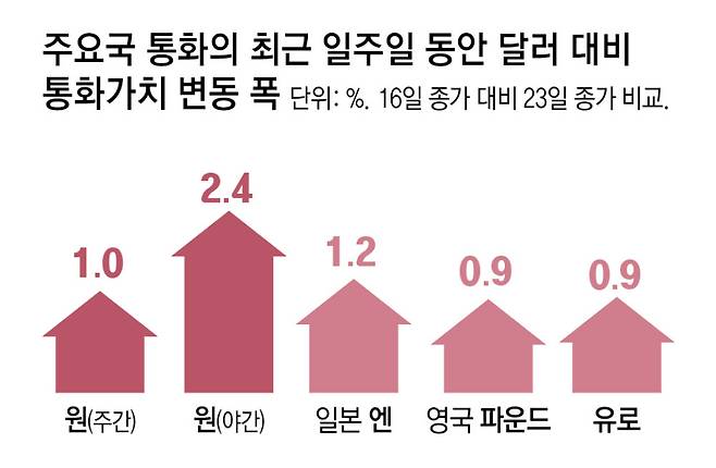 최근 일주일 동안 원화 가치는 주요 통화 가운데 가장 큰 폭으로 상승했다. 한국은행에 따르면 16일과 23일 종가를 기준으로 달러 대비 가치를 비교했을 때 원화는 야간거래 기준 2.4% 강세를 보였다. 주간거래 기준으론 1.0% 강세였지만 23일 야간거래 하락 폭이 크게 작용했다.
