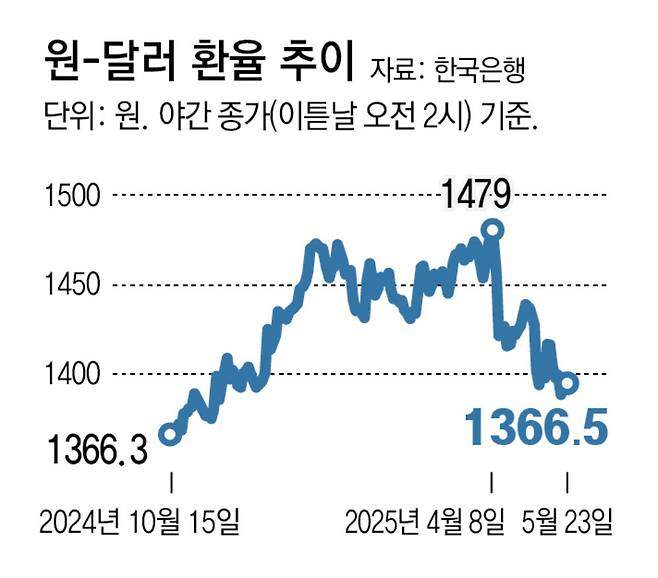 원-달러 환율이 1360원대까지 하락하며 지난해 10월 이후 7개월 만에 가장 낮은 수준으로 떨어졌다. 지난해 11월 미국 대통령 선거나 12월 비상계엄 사태 이전으로 돌아간 셈이다. 미국의 재정 건전성 우려에 따른 글로벌 약(弱)달러의 영향이 크게 작용하는 가운데 최근 원화 강세가 두드러졌다.