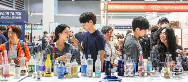 23일 서울 서초구 aT센터에서 열린 ‘2025 대한민국 막걸리 엑스포(막스포)’에서 참관객들이 다양한 종류의 막걸리를 맛보고 있다. 한국막걸리협회가 주최한 이번 행사엔 전국 100여곳의 유명 양조장이 참여해 전통막걸리는 물론 프리미엄막걸리·스파클링막걸리 등 새로운 트렌드를 반영한 다채로운 제품들을 선보였다.