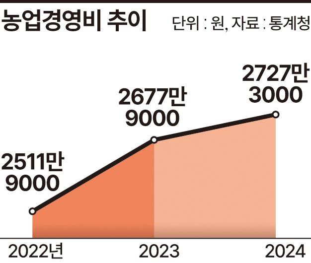 지난해 농업경영비는 전년(2677만9000원)보다 1.8% 오른 2727만3000원으로 집계됐다. 1년새 노무비와 경비가 각각 9.6%·3.3% 오르면서 농가 경영난을 압박했다.