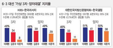문제는 국민의힘 바람대로 두 후보가 단일화하더라도 지지층이 온전히 합쳐지지 않는다는 점이다. ‘보수 단일화’를 가정한 양자대결 구도는 누구로 단일화하든 이재명 후보 지지율에 크게 못 미친다는 사실을 보여준다. 한국리서치가 한국방송(KBS) 의뢰로 전국 유권자 3000명을 대상으로 무선 전화면접 조사(표본오차는 95% 신뢰수준에 ±1.8%포인트, 응답률 19.5%)를 해보니, 3자 구도에서 이재명 후보 49%, 김문수 후보 34%, 이준석 후보 8%였던 지지율 수치가 가상 양자대결에선 이재명 후보 48%, 김문수 후보 39%로 나왔다. ‘이재명 대 이준석’ 구도에선 49% 대 29%로 격차가 더 벌어졌다. 비슷한 결과는 대한민국지방신문협의회가 지난 20~21일 한국갤럽에 의뢰해 전국 1007명을 대상으로 벌인 전화면접 조사(그래픽)에서도 마찬가지로 나온다.