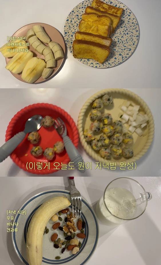 영상에서 윤승아는 프렌치토스트, 바나나, 사과로 아들 원이와 같은 메뉴를 먹었다. 윤승아는 "저희는 아침만 간단히 먹는다. 원이의 점심, 저녁은 한식으로 먹이고 있다"고 설명했다.