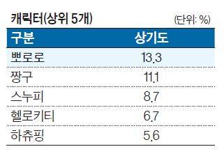 국내 캐릭터 브랜드 경쟁이 치열한 가운데 짱구와 뽀로로는 여전히 건재한 인지도를 자랑하는 것으로 나타났다. 최근에는 ‘캐치! 티니핑’의 하츄핑이 새로운 강자로 떠오르고 있다. 헬로키티·쿠로미·시나모롤 등 산리오 캐릭터와, 춘식이·라이언 등 카카오프렌즈 캐릭터의 인기도 여전했다.
