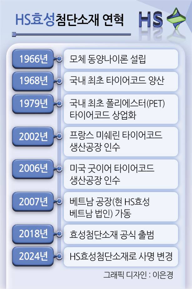 HS효성첨단소재는 올해 7월 출범 1주년을 맞는 HS효성의 핵심 계열사이다. 지난해 상반기까지만하더라도 효성첨단소재로 불렸지만, 효성그룹 계열분리 과정에서 분할된 HS효성에 편입되면서 사명이 변경됐다. 대표 제품은 타이어코드와 ▷탄소가 주성분으로 철보다 강도가 높은 탄소섬유 ▷500℃ 이상 고온에도 견딜 수 있는 아라미드 등이다.