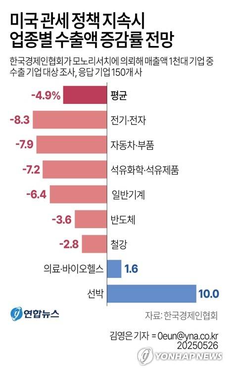 한국경제인협회가 모노리서치에 의뢰해 매출액 1천대 기업 중 수출 기업을 조사한 결과, 응답 기업 150개 사는 미국의 관세 정책이 지속하면 올해 수출액이 작년보다 4.9% 감소할 것이라고 전망했다. 각 사의 전망치를 산술 평균 낸 값이다.