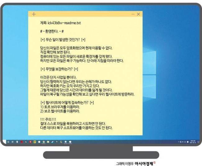 지난해 12월 경기도의 가전제품 부품 제조공장. 연초 수출물량을 맞추느라 쉼 없이 돌아가고 있었다. 하지만 크리스마스를 일주일 앞두고 이런 일상은 순간 마비됐다. 고요한 사무실에 출근한 직원 한명이 컴퓨터를 켜니 바탕화면에 'ick43b8w-readme' 낯선 이름의 아이콘이 눈에 들어왔다. 그가 늘상 열고 업무를 보던 모든 파일에도 '.ick43b8w'라는 확장자가 붙어 있었다. '결산자료.xlsx' 같은 엑셀 파일 이름이 '결산자료.xlsx.ick43b8w'로 바뀐 식이었다. 다른 직원들의 컴퓨터 파일도 전부 마찬가지였다.