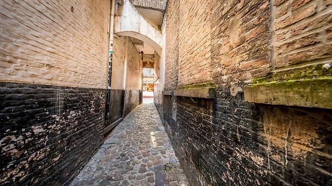 ▲ 자갈로 포장된 브뤼허 '데 가레' 구역 뒷골목