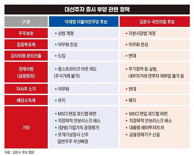 가장 큰 차이는 상법개정안이다. 상법 개정으로 주가를 끌어올릴 수 있느냐에 대한 논란이 치열하지만 이재명 후보는 꼭 필요하다는 입장이다. 한국 기업은 소액주주와 대주주 간 이익이 불일치할 때가 많기 때문이다.