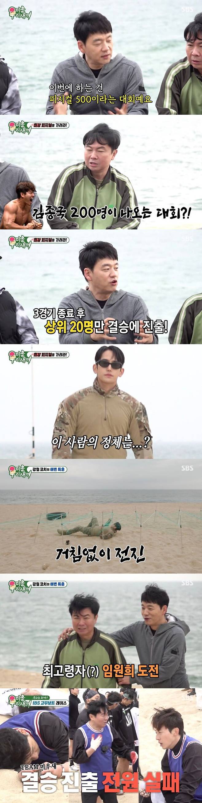 이날 김승수는 임원희, 허경환에게 피지컬 500 대회에 함께 나가자며 "종국이만 200명 모인다고 생각하면 된다. 3경기 종료 후 20명만 추려서 다음 경기에 출전하는데 20명에 선발되기 위해 훈련을 준비했다"라고 밝혔다.