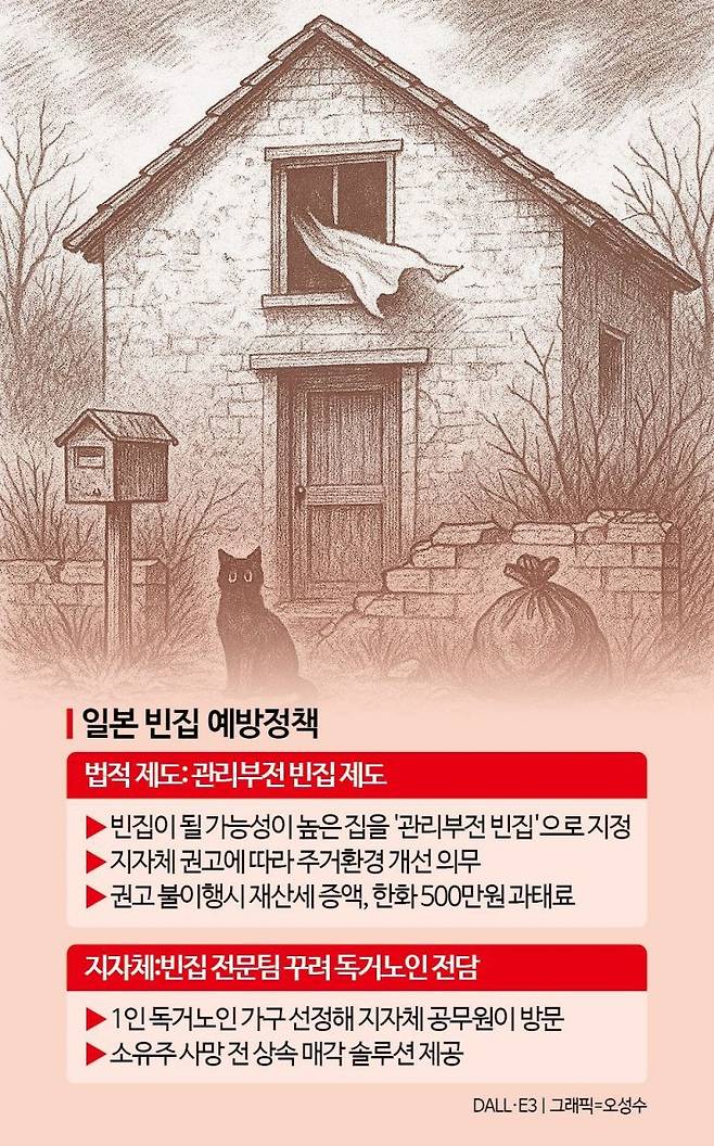 농어촌 빈집, 사후 관리 그쳐…예방책부터 논의해야한국보다 먼저 빈집 문제를 겪은 일본은 '빈집 예비군(집)'을 선정해 관리하고 있다. 도쿄 세타가야구의 경우 구청 직원이 독거노인 가구를 중심으로 빈집 예비군을 선정한 뒤 수시로 방문해 처분을 상담한다.