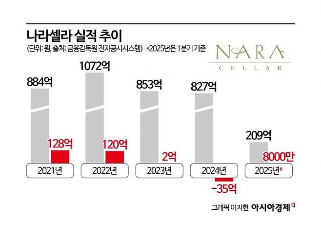 나라셀라는 2023년 6월 국내 와인 수입사 최초로 코스닥 시장에 상장한 뒤, 1년 만인 지난해 적자 전환했다. 매출액은 827억원으로 전년 대비 3.1% 감소했고, 34억원의 영업 손실을 냈다. 이 과정에서 부채도 늘어났다. 단기차입금이 2023년 109억원에서 지난해 177억원으로 1년 새 61.6% 증가했고, 이로 인해 부채비율도 2023년(87.4%)에서 지난해 102.8%로 15.4%포인트 늘어났다.