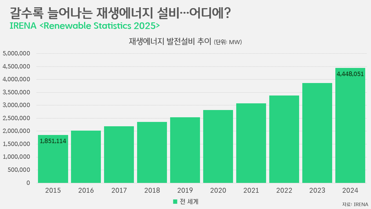 재생에너지의 영향력이 얼마나 커졌는지는 발전설비의 절대적인 용량보다, 그 비중을 통해서 확인할 수 있습니다. 2015년, 세계적으로 전체 발전설비 가운데 29.5%의 비중을 차지했던 재생에너지는 2024년 46.4%로 '주력 발전설비'가 됐습니다. 명실상부한 '주력'임에도 우리가 이를 크게 체감하지 못 하는 데엔 발전원의 독특한 특징이 한몫 합니다. 그 자체로 거대한 '단지'를 이뤄 철옹성 같은 펜스와 보안 인력으로 겹겹이 둘러싸인 전통의 발전설비와 달리, 재생에너지 발전설비는 상대적으로 소규모로, 곳곳에 흩어져있기 때문입니다. 그나마 풍력발전이야 랜드마크처럼 멀리서도 볼 수 있지만, 태양광은 형태에 따라 대규모로 모여있기도, 흩어져있기도, 우리의 눈높이와는 전혀 다른 높이에 설치되기도 하니까요. (물론, 여기서 '우리'는 국제사회 차원에서의 '우리'입니다. 국내에선 그 설비 자체가 그리 많지 않기에, 애당초 체감을 운운하기 어려운 상황입니다.)