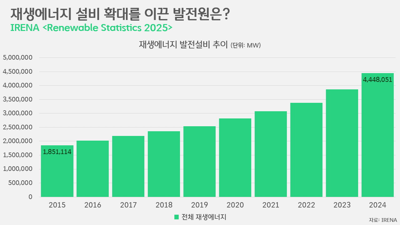 국내에서의 여러 갑론을박과 무관하게 글로벌 차원의 발전부문 에너지전환은 꾸준히 진행 중입니다. 이제 막 기후변화 대응에 대한 국제사회의 합의가 이뤄지고, 대응의 핵심으로 전력의 탈탄소화가 꼽히기 시작한 2015년, 1,851GW 수준이었던 전 세계 재생에너지 발전설비는 지난해 4,448GW로 늘어났습니다. 증가세는 꾸준함을 넘어, 해마다 그 폭이 더 커졌고요. 온실가스 감축의 측면에서 봤을 때, 이는 반가운 소식이기도, 경계해야 하는 소식이기도 합니다. 대표적인 무탄소 발전원인 재생에너지를 활용한 발전설비가 늘어난 만큼, 과거와 같은 양의 전력을 소비하더라도 지구를 덜 달구게 됐다는 것은 반가운 일입니다. 다만, 성장세가 계속 커지고 있다는 것은 바꿔 말하면 '아직도 우리는 갈 길이 멀다'는 뜻이기도 합니다. 절대적인 설비 용량은 늘어나되, 그 성장세가 완만해졌을 때, 비로소 발전설비의 전환이 8부 능선을 넘어선 것이니까요.