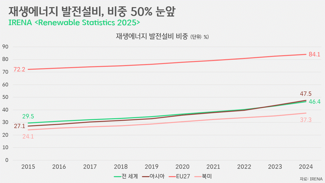 지역별로 보면, 2015년 기준 아태와 북미 지역에서의 재생에너지 발전설비 비중은 각각 27.1%와 24.1%로 글로벌 수준을 밑돌았습니다. 하지만 2024년, 아태 지역에서의 재생에너지 발전설비가 전체 발전설비에서 차지하는 비중은 47.5%로 세계 평균을 넘어섰죠. 북미의 경우, 지난해 37.3%라는 '역내 역대 최고'를 기록했습니다만, 여전히 세계 평균을 밑돌고 있습니다. EU는 예나 지금이나 2015년 72.2%에서 2024년 84.1%로 세계 최고 수준을 보여주고 있고요. 이미 전체 발전설비의 대부분을 재생에너지가 차지하고 있기에, “연평균 증가분이 적다. 그러니 유럽에서 재생에너지 확산세는 주춤하고 있다”고 볼 수 없는 것은 당연한 일입니다.