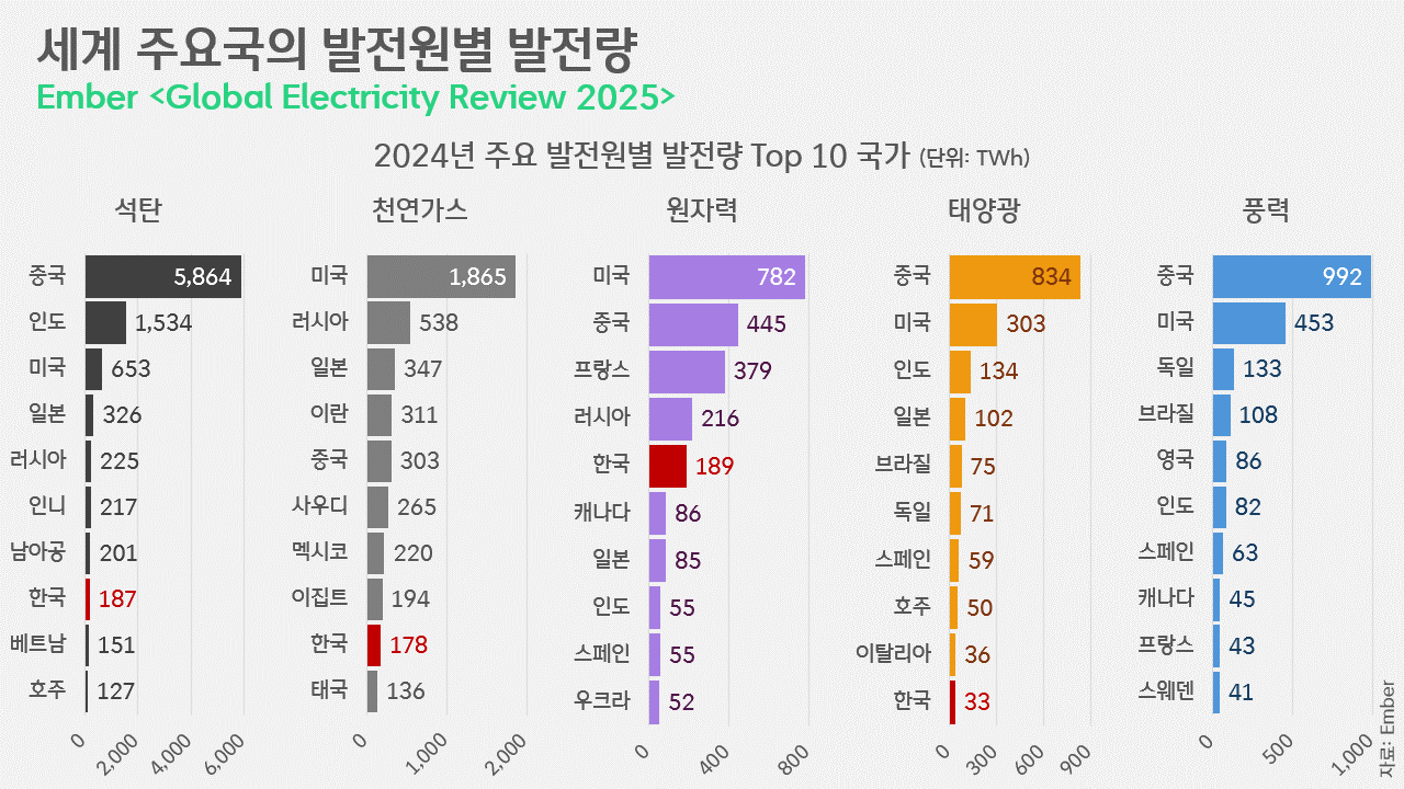 그렇다면, 이들 지역의 주요 국가들의 상황은 어떨까요. 아태의 대표 국가인 한중일 3국과 EU의 대표주자인 프랑스와 독일, 그리고 EU에선 떠났지만 유럽권의 대표국인 영국, 그리고 북미를 대변하는 미국의 재생에너지 발전설비 비중도 살펴봤습니다. 이들 7개국 가운데 '10년째 꼴찌'를 기록하고 있는 나라는 모두가 예상하듯 한국이었습니다. 2015년 6.9%였던 재생에너지 발전설비 비중은 2024년 21.1%로 증가했습니다. 분명 3배 가량 늘어났지만, 이웃나라인 일본(2015년 20.7%, 2024년 35.5%)과 세계 최대 규모의 산유국인 미국(2015년 18.2%, 2024년 34%)보다 여전히 한참 부족합니다. 우리는 '아태 지역 평균'을 깎아 먹는 '주범'인 셈입니다.