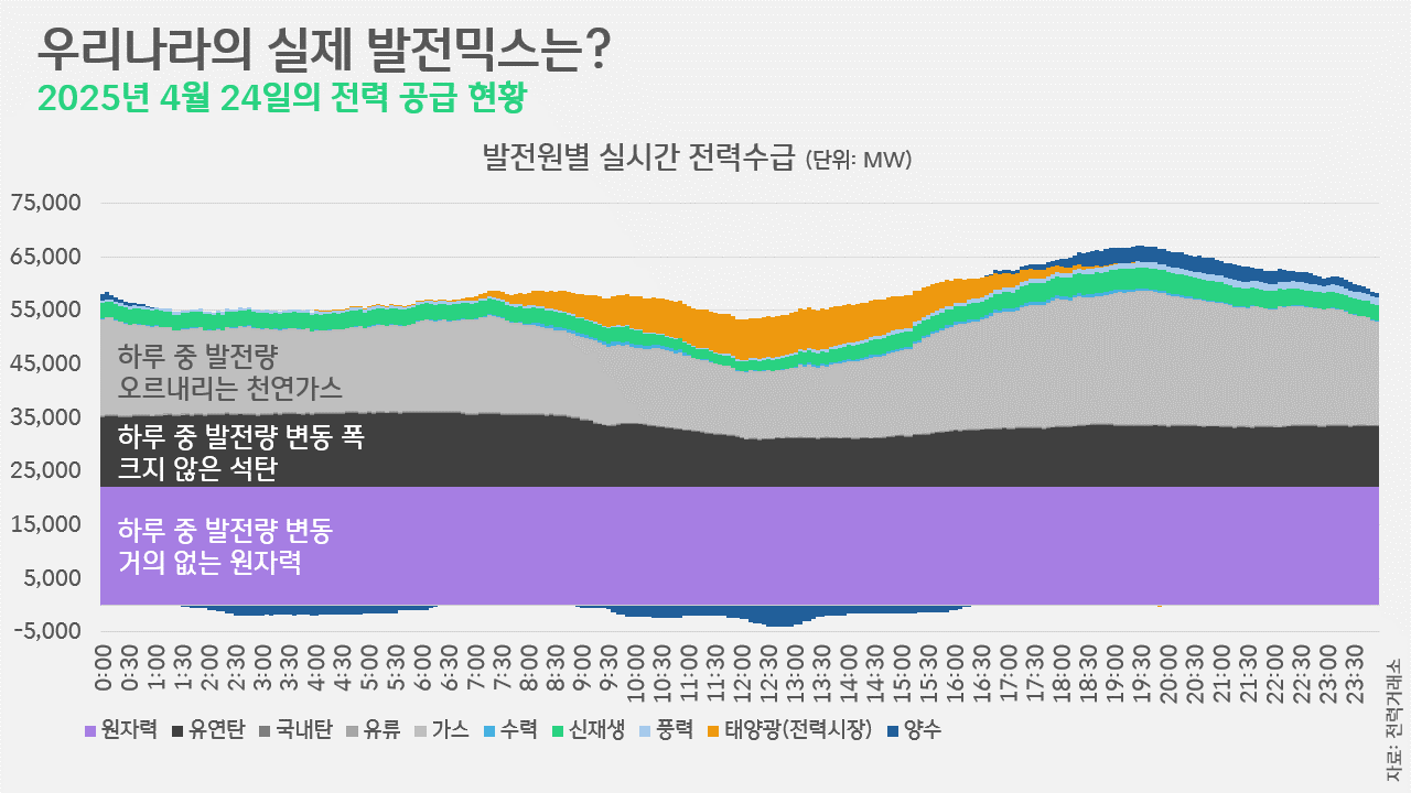 그런데, 이들 발전원 전체의 발전량을 더한 그래프의 모양이 조금 이상합니다. 모두가 가장 열심히 활동하고, 그래서 가장 많은 에너지를 필요로 하는 한낮의 수요가 가장 적습니다. 이날 24시간 가운데 가장 발전량이 적었던 순간은 정오를 막 지난 오후 12시 35분으로, 이때 전력시장에서 거래된 모든 발전설비의 출력 합계는 4만 9,737MW에 그쳤습니다. 양수발전을 활용해 남는 전력을 물의 위치에너지로 바꿔 저장해야 할 정도였습니다. 가장 많은 출력을 냈던 때는 저녁 7시 25분(6만 7,139MW)였습니다. 하루 중 양수발전이 가장 열심히 전기를 만들어냈던 것도 이때였고요.