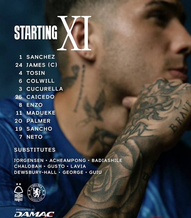 원정팀 첼시는 4-2-3-1 전략을 준비했다. 로베르트 산체스가 골문을 지켰다. 마크 쿠쿠렐라, 리바이 콜윌, 토신 아다라비오요, 리스 제임스가 백4를 구성했다. 그 앞에 모이세스 카이세도, 엔소 페르난데스가 위치했다. 제이든 산초, 콜 파머, 노니 마두에케가 중원에 이름을 올렸고 최전방은 페드루 네투가 나섰다.