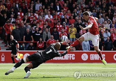 노팅엄이 결정적 기회를 놓쳤다. 전반 43분 우측면에서 아이나가 박스 안으로 크로스를 올렸다. 중앙에 있던 우드가 슈팅까지 연결했지만, 공은 골문 상단으로 살짝 벗어났다.