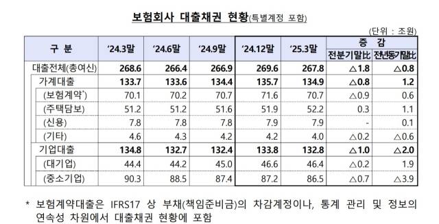 26일 금융감독원에 따르면 3월 말 기준 보험사 대출채권 잔액은 267조 8000억 원으로 전 분기보다 1조 8000억 원 줄었다. 가계대출은 8000억 원 감소한 134조 9000억 원, 기업대출은 1조 원 줄어든 132조 8000억 원으로 나타났다.