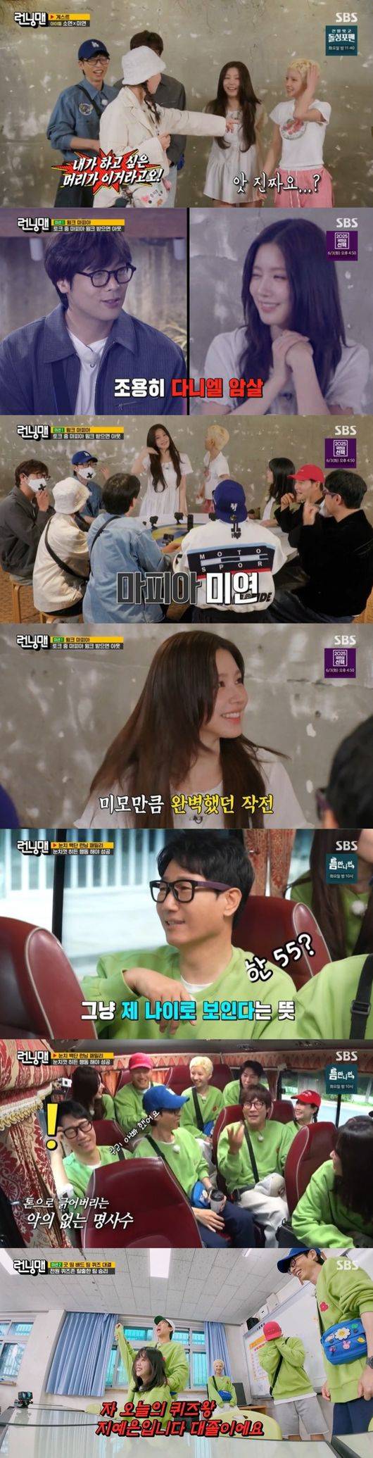 김종국은 “나 아니다. 나 원래 이런 거 하면 중간에 웃는다. 소연이 아니면 지예은이 마피아”라며 반박했지만 멤버들의 선택은 김종국이었다. 하지만 마피아는 아이들 미연이었고 소연은 “배신감 너무 느낀다”라며 놀라워했다. 반면 미연의 윙크를 맞은 최다니엘은 “윙크 맞으니까 기분이 너무 좋아지는 거야”라며 부끄러워해 웃음을 자아냈다.