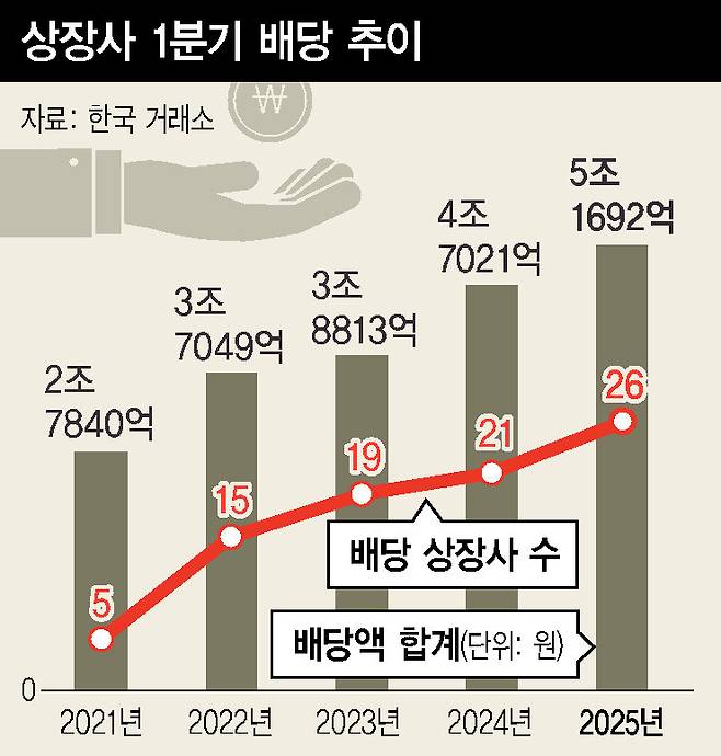 26일 한국거래소 공시시스템을 보면, 실적 시즌이 마무리된 뒤 1분기 분기배당을 하는 상장사가 26개사로 집계됐다. 배당금 총액은 5조1692억원이다. 이는 지난해 1분기의 21개사에서 5개사 더 늘어나고, 배당금이 4조7021억원에서 9.9% 늘어나면서 사상최대치를 고쳐쓴 것이다.