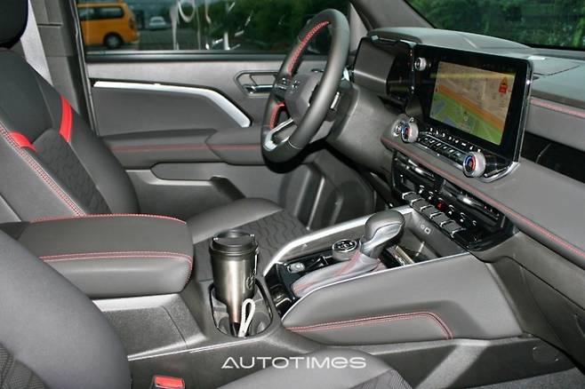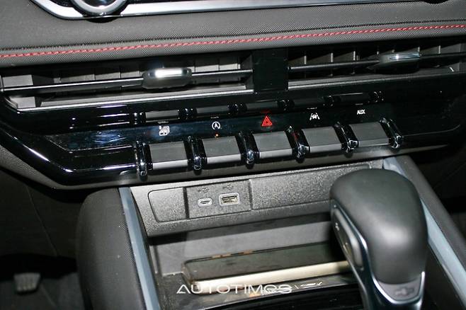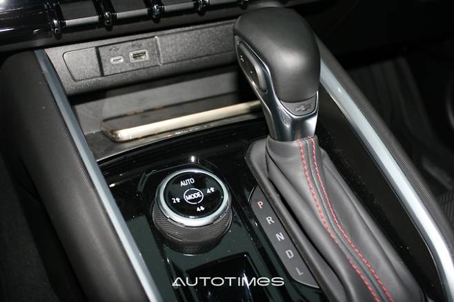 아래에는 USB 타입 A와 C 커넥터가 있고 무선 충전 패드가 위치한다. 센터터널에는 자동변속기 기어레버와 함께 4륜구동 및 드라이브 모드를 조절할 수 있는 다이얼 스위치가 있다. 뒤쪽에는 대용량 텀블러도 수납 가능한 크기의 컵홀더가 위치하며 중앙에는 스마트폰을 거치할 수 있는 전용 홀더도 마련했다. 센터 콘솔은 단면적은 다소 좁은 편이지만 깊이가 깊어 수납력이 좋다. 내부에는 추가 선반을 제공해 다양한 소지품을 효율적으로 보관할 수 있다.