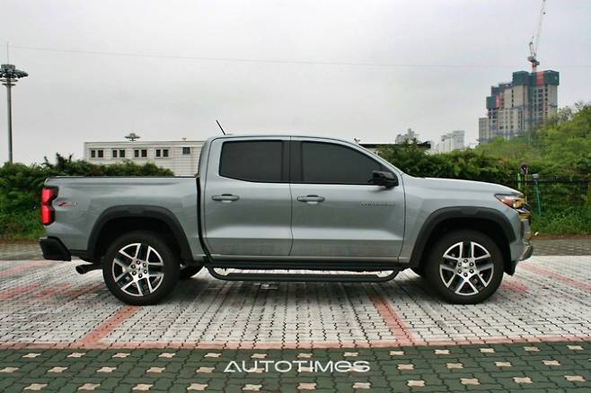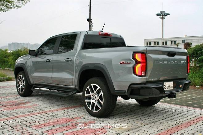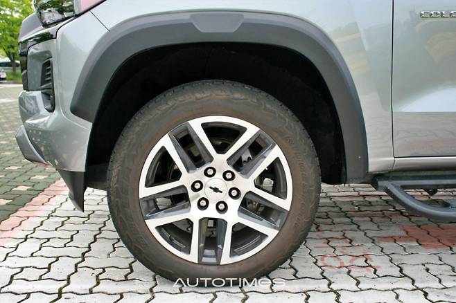 GMC 캐년과 달리 콜로라도는 휠아치 크레들 상단 홈에 차폭 등이 들어가지 않아 비어 보이지만, 전체적인 구성은 탄탄하다. 2열과 후면 유리는 프라이버시 글래스로 마감돼 북미 특유의 실용성과 고급감도 느껴진다. 휠은 20인치 다크 안드로이드 알로이 휠이다. 타이어는 내구성이 높은 브리지스톤 듀얼러 AT RH-S(255/55/R20)로 조합이다.