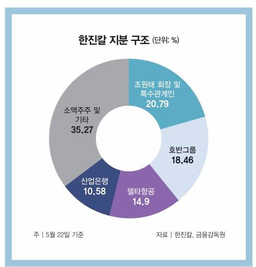 기업분석연구소 리더스인덱스의 박주근 대표는 5월 21일 호반그룹의 한진칼 지분 매입에 대해 이렇게 분석했다. 2022년부터 한진칼 '2대 주주' 지위를 갖고 있는 호반은 이달 들어 또 한 번 지분율(17.44→18.46%·그래프 참조)을 끌어올렸다. 호반 측은 '단순 투자' 목적이라며 경영권 분쟁 가능성에 선을 그었지만 재계에서는 호반이 궁극적으로 '탈(脫)건설'을 꾀하고 있다고 분석한다.