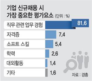 26일 한국경영자총협회가 100인 이상 기업 500개 사를 대상으로 ‘2025년 신규채용 실태조사’를 실시한 결과 응답 기업의 81.6%는 신규채용에서 가장 중요한 평가 요소로 ‘직무 관련 업무 경험’을 꼽았다. 이어 자격증(7.4%), 소프트 스킬(인성·리더십 등·5.4%), 학력(전공·학교 등·2.6%), 대외활동(학회·공모전 등·1.4%) 순이었다.