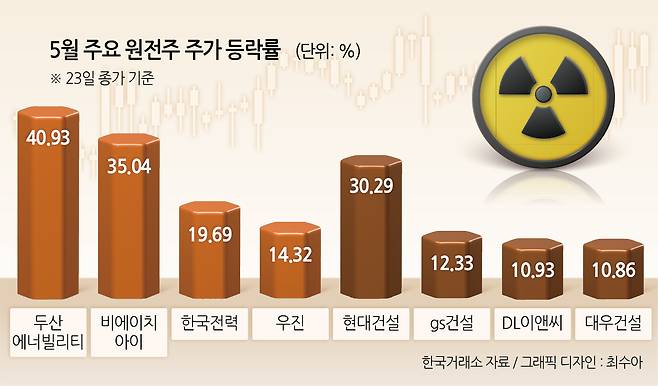 글로벌 원전 르네상스가 펼쳐지는 상황 속에 국내 건설회사의 원전 시공 능력이 부각, 주요 건설주도 큰 폭의 상승세를 보였다. 현대건설의 주가가 5월 들어 30.29%(4만1600→5만4200원) 상승했고, GS건설 12.33%(1만8250→2만500원), DL이앤씨 10.93%(4만3450→4만8200원), 대우건설 10.86%(3545→3930원) 등의 주가도 이달 강세를 보였다.