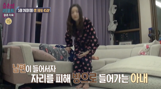 부부는 현재 방송 일을 관두고 발달장애 아동들을 위한 체육센터를 운영 중이다. 퇴근 후 장모님과 7살 딸, 12살 아들과 식사를 마친 부부. 아내는 식사가 끝나자마자 안방으로 들어가 불도 켜지 않은 채 침대에 눕는다. 둘째 딸과 놀아주던 남편이 거실에 나와 아이들과 같이 시간을 보내자고 수차례 요청해도 거절하는 아내. 남편은 가족이 유일하게 다 같이 모일 수 있는 저녁 일과 시간에 항상 혼자 방에 있고 싶어 하는 아내를 이해할 수 없다며 답답해한다. 하지만 아내는 자신은 너무 피곤해 잠들기 전 2~3시간가량 혼자 조용히 쉬는 시간이 필요하다고 팽팽히 맞선다. 잠시 후, 아내는 조용히 자신 곁에 누워있던 12살 아들에게도 혼자 있고 싶다고 말하며 ‘가족이 꼭 같이 있어야 하는 거냐, 엄마 몸만 가족들과 같이 거실에 나가 있으면 되냐’와 같은 이해할 수 없는 질문을 던지는데. 심지어 아내는 당황한 아들과, 엄마를 찾아 방으로 들어온 딸 앞에서 혼자 있고 싶다며 오열하는 모습을 보여 스튜디오를 충격에 빠뜨린다. 과연 아내는 왜 이렇게까지 혼자이고 싶어 하는 걸까.