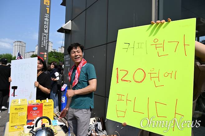 | ▲ 김문수 유세장에 등장한 '커피 120원에 판다' 김문수 국민의힘 대선후보 유세가 열린 20일 서울 서초구 고속터미널역 앞에서 김문수 지지자들이 커피를 120원에 판매한다고 써붙이고 있다. |