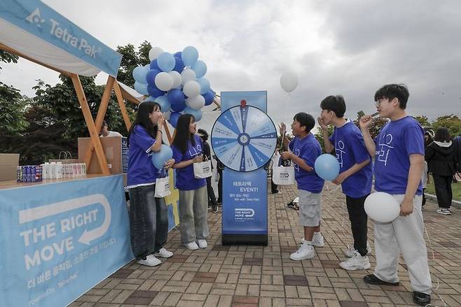 난빛축제에 참여한 나우리 중등연합 학생들이 테트라팩 다트룰렛 이벤트에 참여하고 있다. 이날 테트라팩은 멸균팩 재활용 수거 캠페인 등 다양한 프로그램을 전개하며 멸균팩의 올바른 분리배출 방법과 재활용의 중요성을 알렸다. (사진=테트라팩 코리아 제공) 2025.05.26. photo@newsis.com *재판매 및 DB 금지