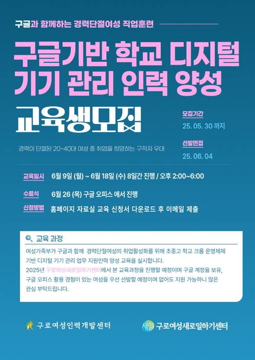 구로여성인력개발센터에서 '구글기반 학교 디지털 기기 관리 인력 양성' 교육과정을 개설하고, 교육생을 모집한다고 밝혔다.