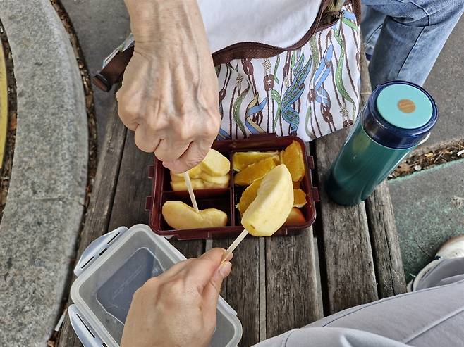 | ▲ 엄마가 싸온 과일 도시락과 커피 엄마 혼자 다니는 여행의 필수품은 간단한 간식과 커피다. |
