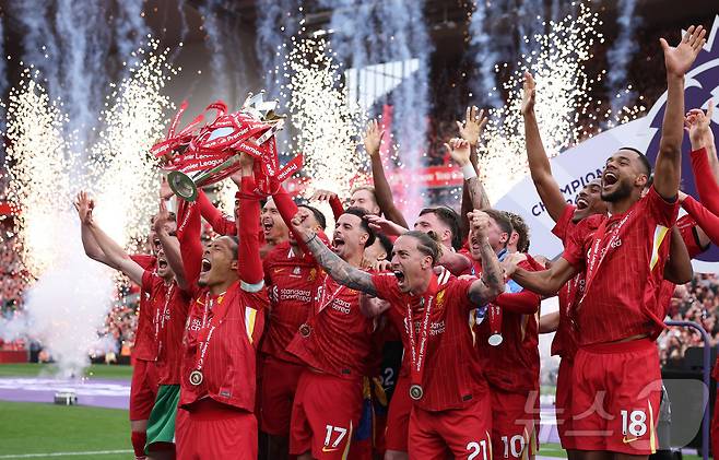 (리버풀 로이터=뉴스1) 우동명 기자 = 리버풀의 선수들이 25일(현지시간) 영국 리버풀의 안필드 스타디움에서 열린 프리미어 리그 크리스털 팰리스와 경기를 마친 후 우승 트로피를 들고 환호를 하고 있다. 2025.05.26