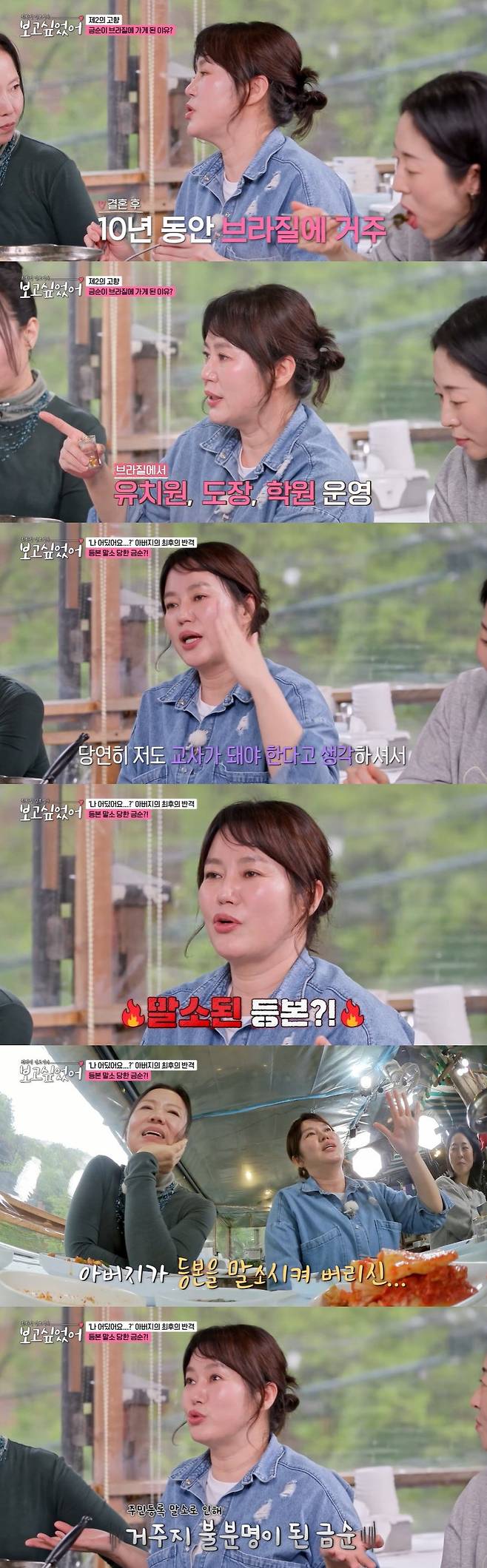 김금순은 "공연하러 갔다가 거기서 애들 아빠를 만났다. 한국에서 결혼하고 (브라질에) 들어가서 10년 살았다"며 결혼 후 브라질 거주 사실을 밝혔고, "그때는 그냥 툭툭 진행이 됐던 것 같다"며 당시 상황을 전했다.